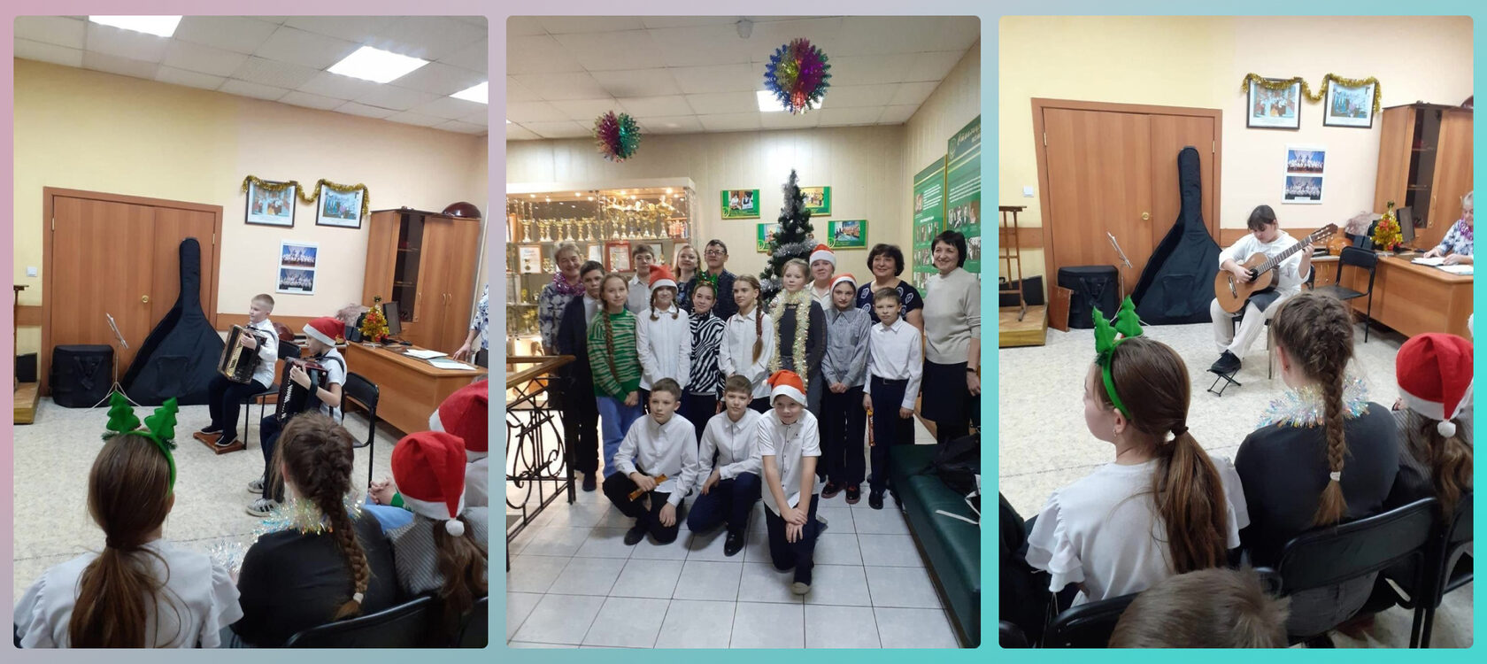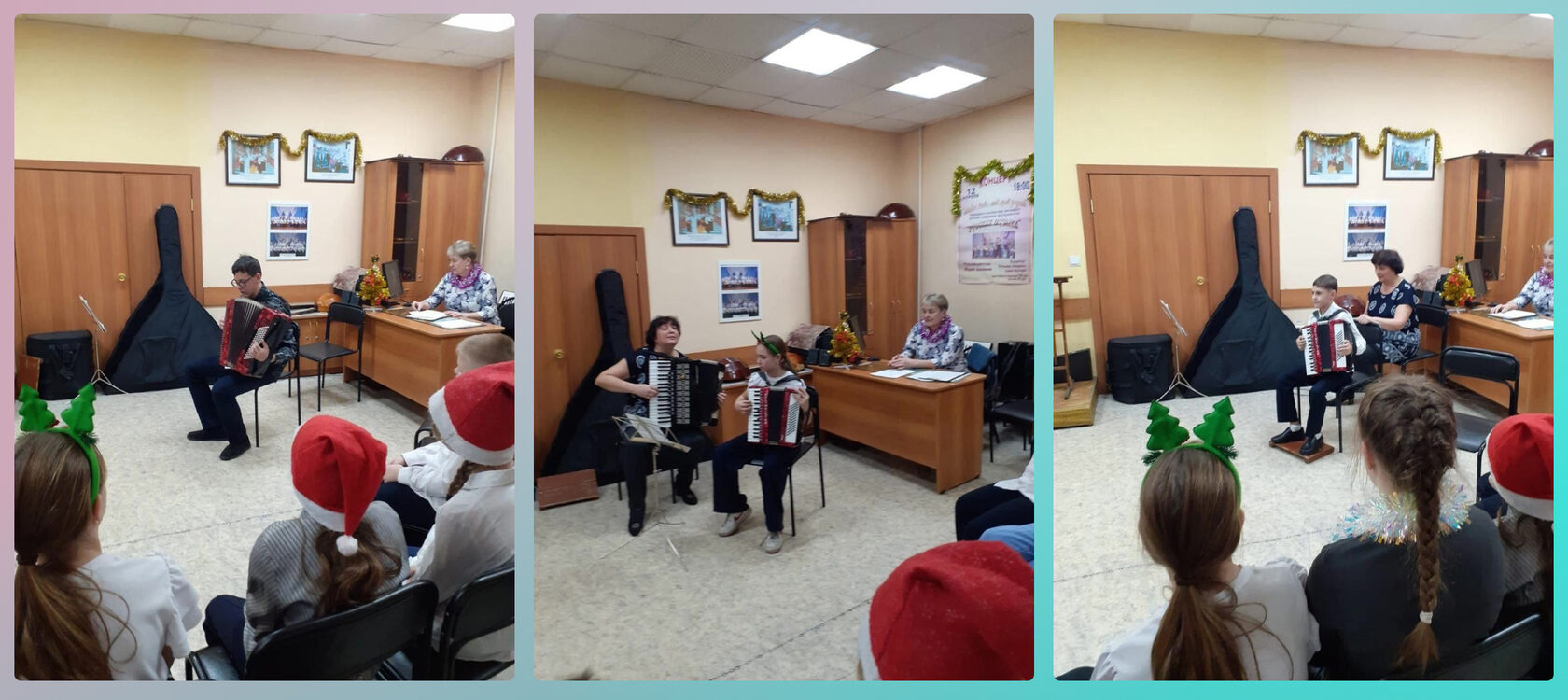 Ребята вместе со своими преподавателями подготовили не только музыкальные пьесы, исполняемые сольно и в ансамблях, но и рассказывали новогодние стихотворения, пели песни, играли на шумовых инструментах.