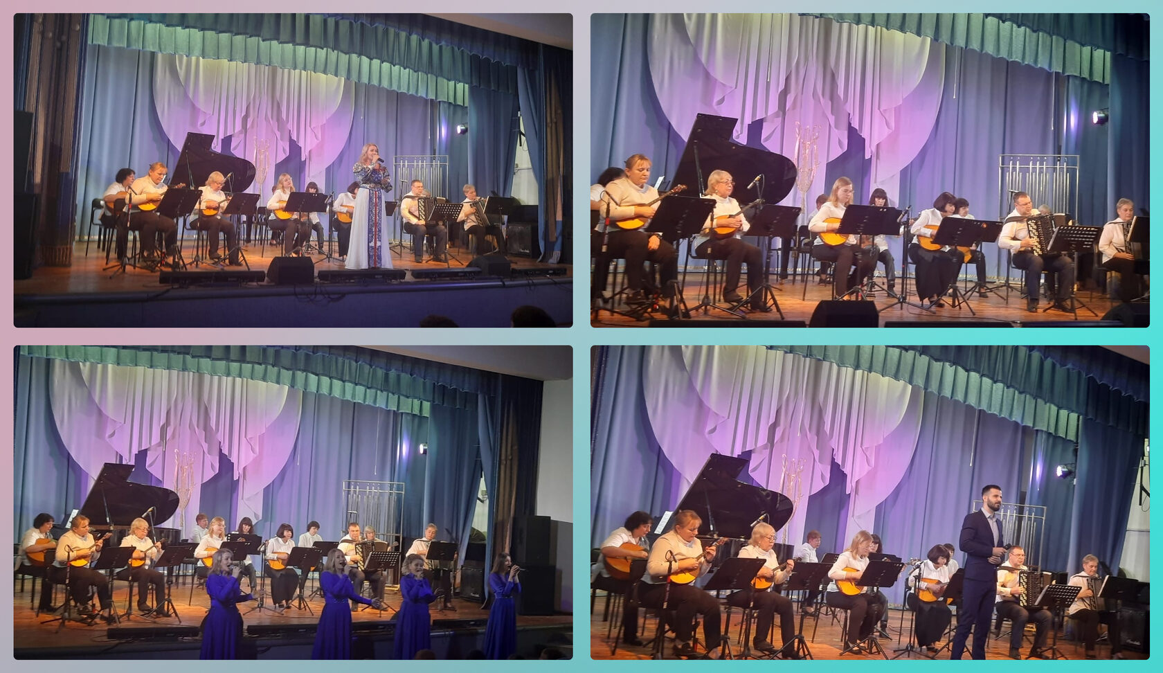 В исполнении ансамбля прозвучали инструментальные патриотические произведения о Родине, любви к своей земле и России, а так же популярные песни в исполнении вокального ансамбля и солистов коллектива Т. Лавровой и В. Бугеря.