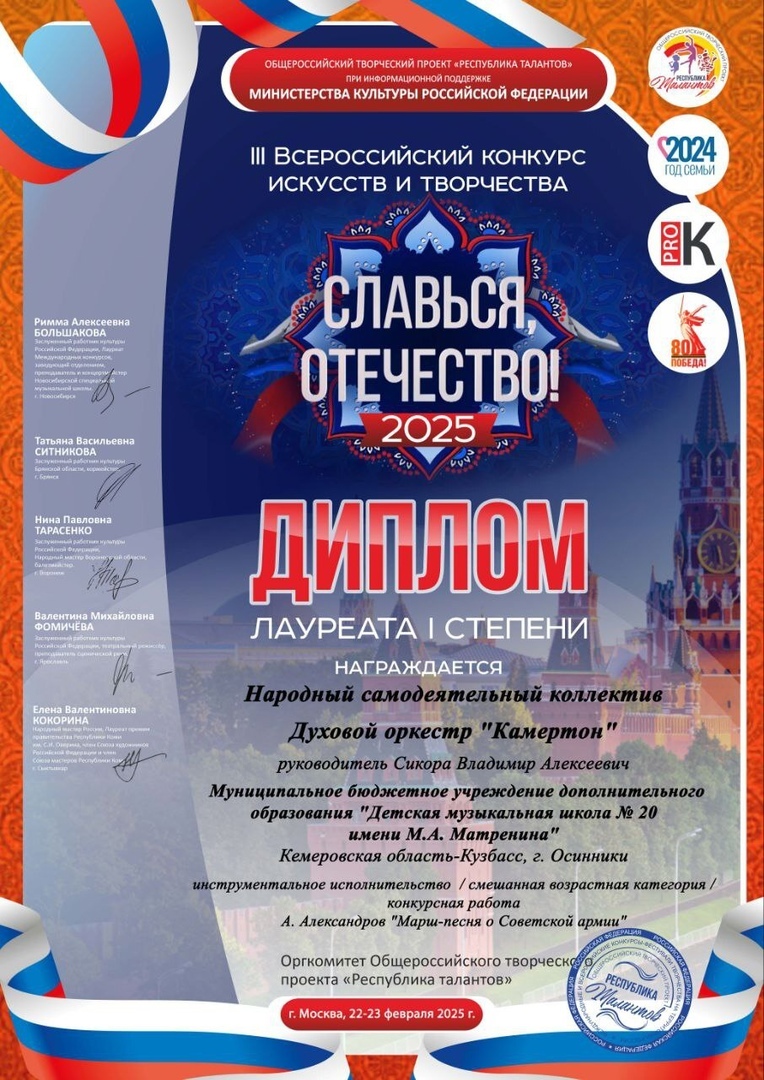 Народный коллектив оркестр духовых инструментов "Камертон", занял I место в III Всероссийском конкурсе искусств и творчества " Славься, Отечество! "