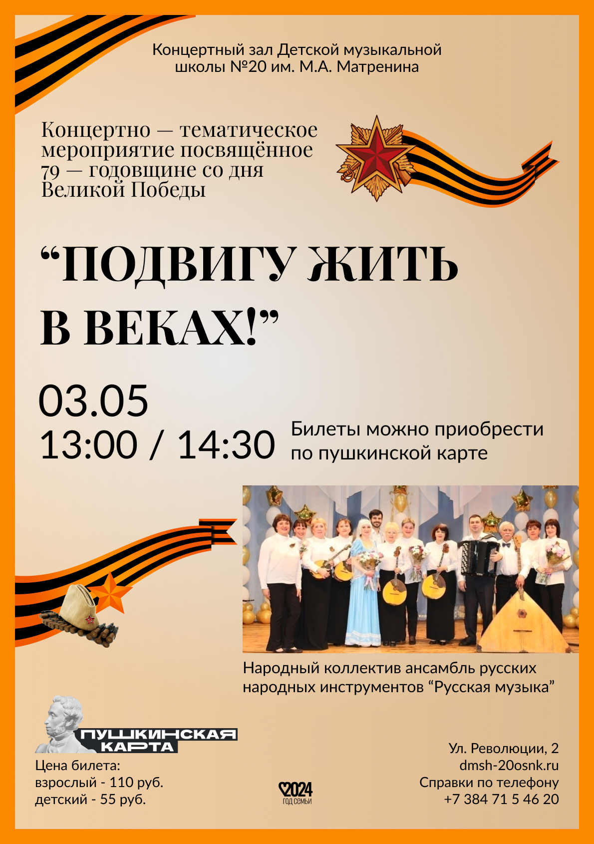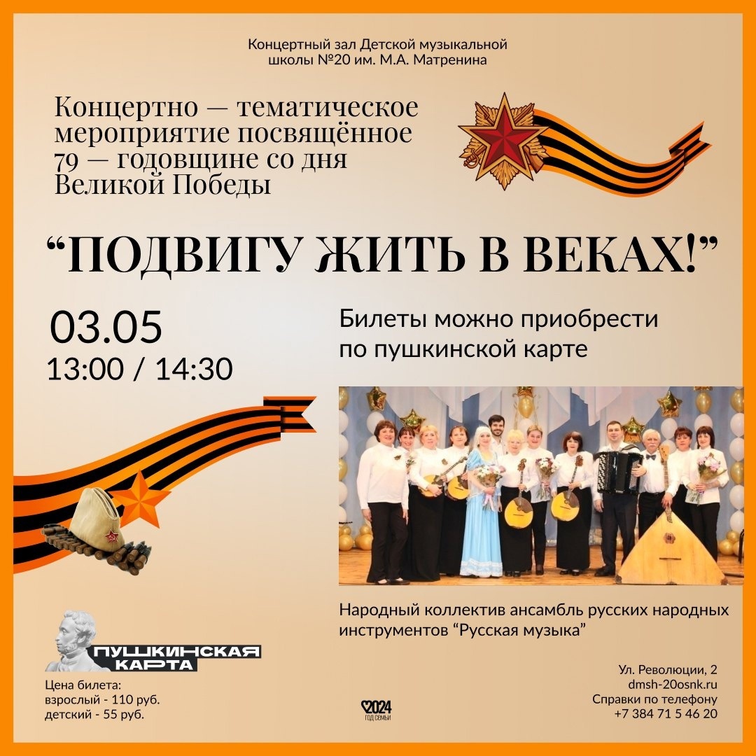 3 мая 2024 года в концертном зале МБУДО ДМШ №20 им. М. А. Матренина состоится тематический концерт – лекция патриотической направленности, для учащихся средних и старших классов общеобразовательных школ города «Подвигу жить в веках!» Народного коллектива ансамбля русских народных инструментов «Русская музыка», посвящённый Дню Победы! Главная цель мероприятия: воспитание, в том числе и с помощью музыкального материала, благодарного отношения к подвигу солдат, уважение к людям старшего поколения и чувства гордости за подвиг нашего народа в годы ВОВ. С помощью музыкального материала задача организаторов – сформировать причастность к историческим событиям тех лет, а так же популяризации вокальной и инструментальной музыки военной тематики. В исполнении ансамбля прозвучат инструментальные произведения русских и советских композиторов о родине, русской природе, любви к своему отечеству, а также военные песни в исполнении солистов коллектива В. Бугеря и Т. Лавровой. Мероприятие будет иметь большой воспитательный эффект и познавательную ценность, также в музыкальную программу будет включен тематический фото и видео материал, который будет нести в себе ярко выраженную патриотическую, гражданскую направленность и познавательную ценность. Содержание мероприятия будет иметь ярко выраженный воспитательный эффект , яркую эмоциональную насыщенность и богатый духовный потенциал.